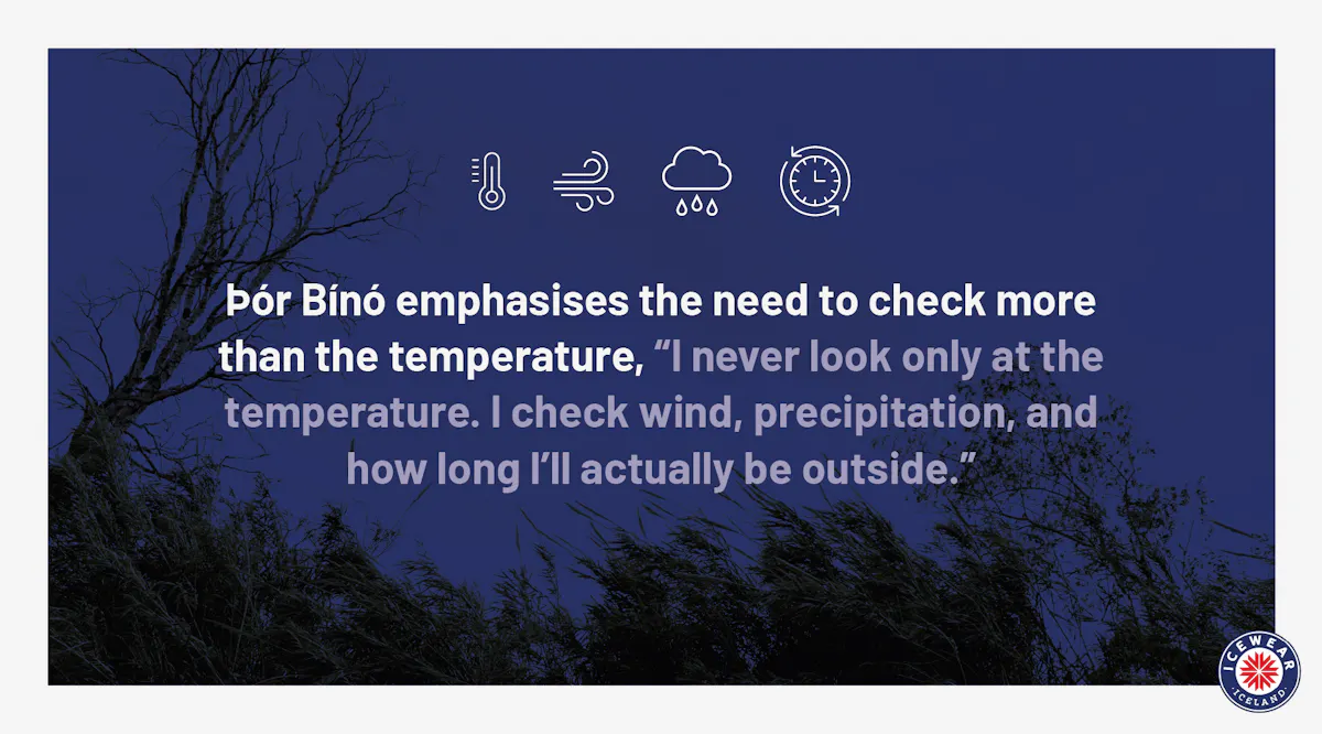 How active you will be: Activity level plays a big role in how warm you stay. As Bínó explains, people often feel the cold most when they stop moving. He points to northern lights trips as a common example, where standing still causes body heat to drop quickly. Consider whether you’ll be walking, running, or stopping for long periods, and plan extra layers you can add during breaks.